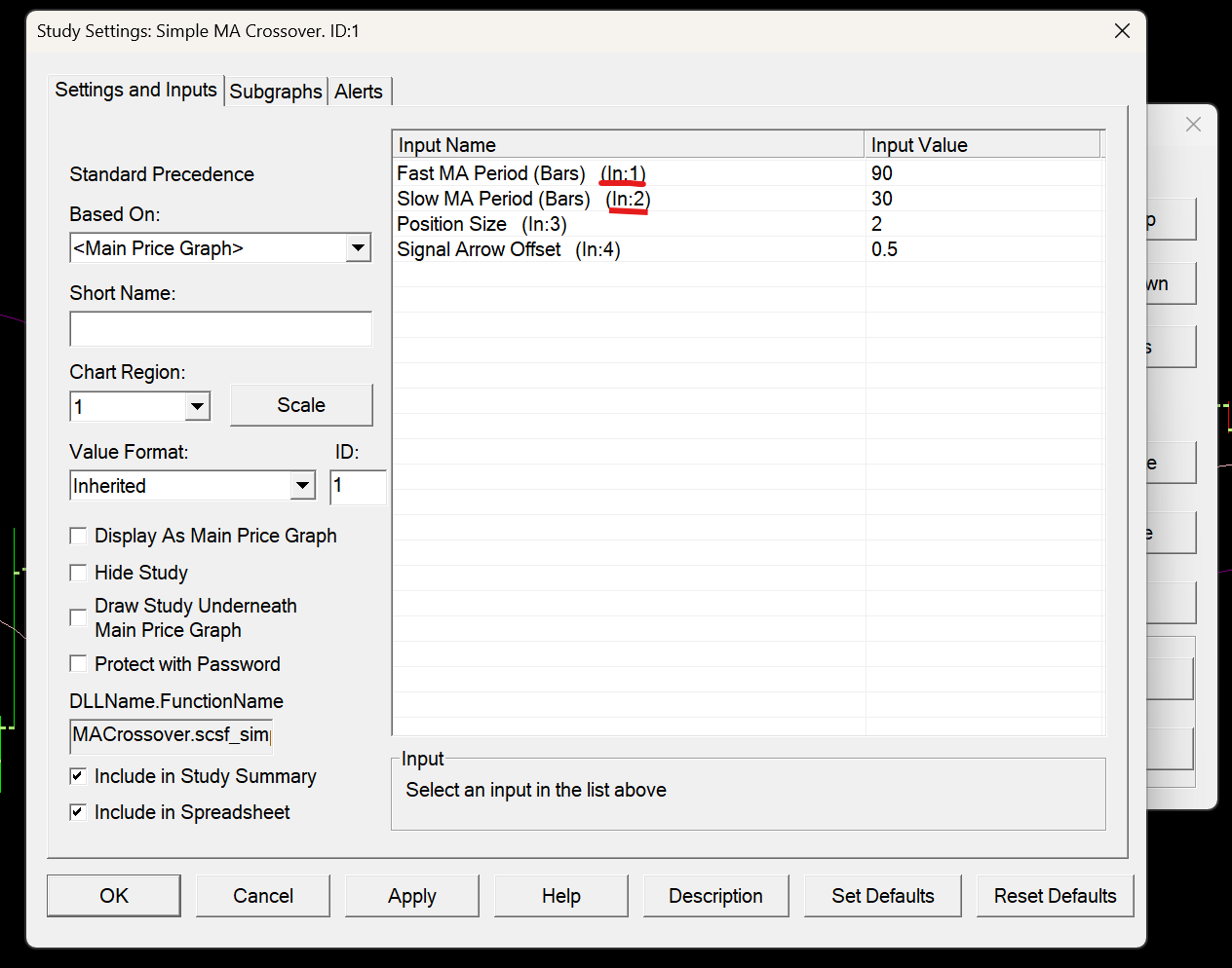 method can be used to set study inputs. Note how this method wants an index for the input to set. This is a 1-based index, and inspecting the study inputs in Sierra Chart shows that the period for the fast MA is input 1 and the period for the slow MA is input 2: